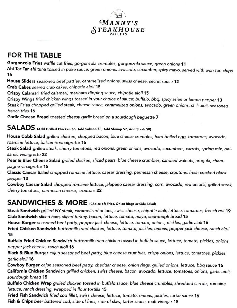 Welcome to Manny’s Steakhouse, a culinary gem nestled along Vallejo’s picturesque Mare Island Way. This vibrant eatery combines the cozy charm of a steakhouse with an inviting atmosphere perfect for any meal of the day. Whether you’re in the mood for a hearty breakfast, a satisfying brunch, or a delightful dinner, Manny's menu boasts an impressive selection.